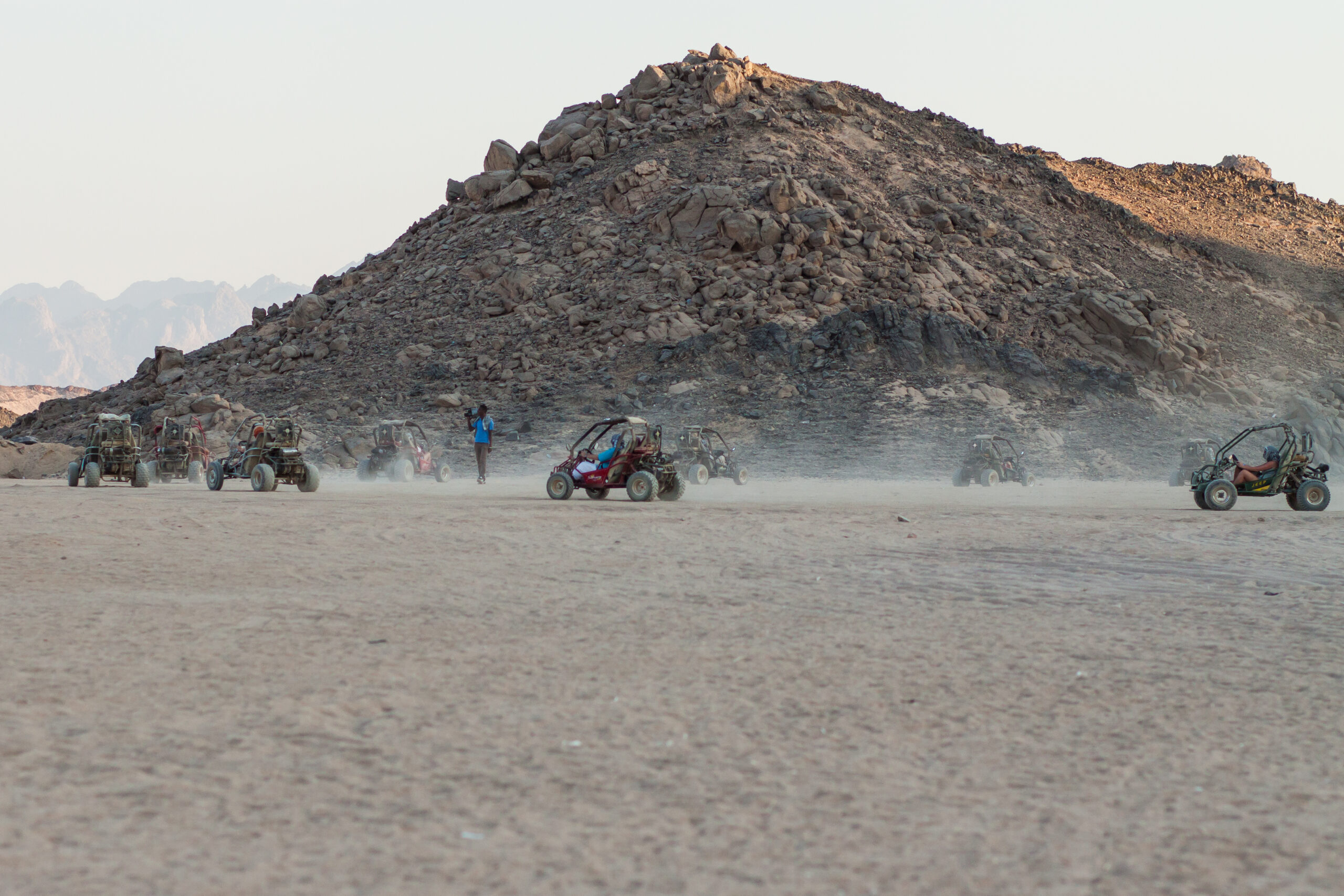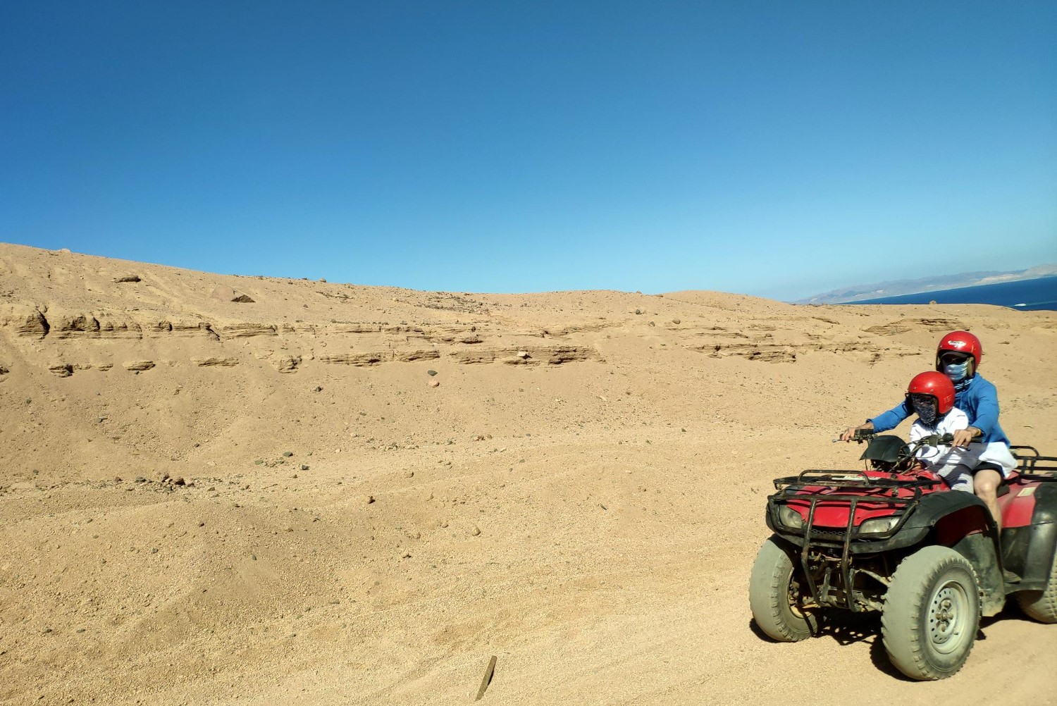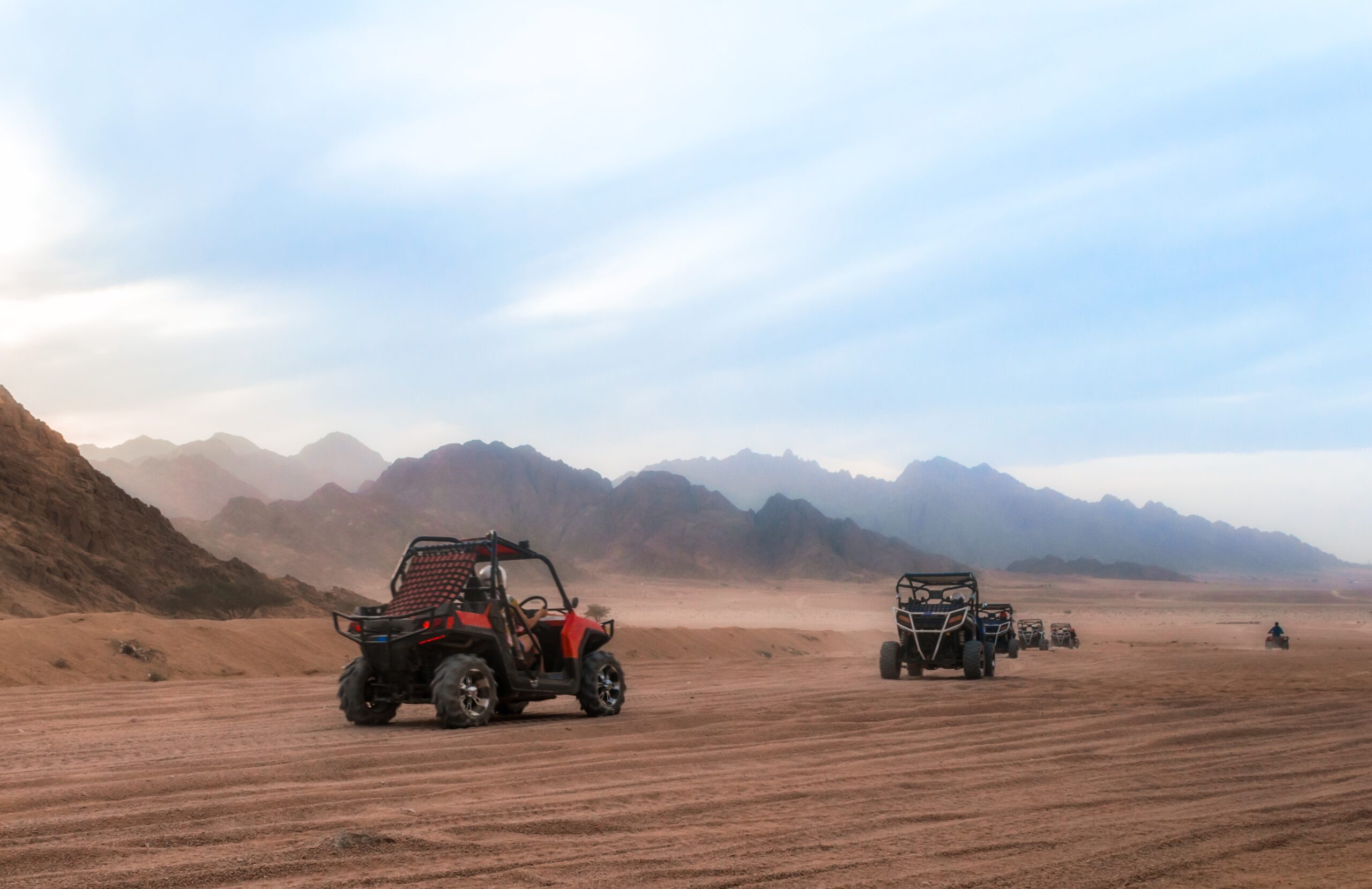 Your journey begins with a pickup from your hotel in Hurghada by a 4×4 Jeep. Head into the heart of the desert where your adventure kicks off with an exciting 45-minute quad bike ride, followed by a 15-minute dune buggy (spider car) ride — fun for adrenaline seekers of all ages.